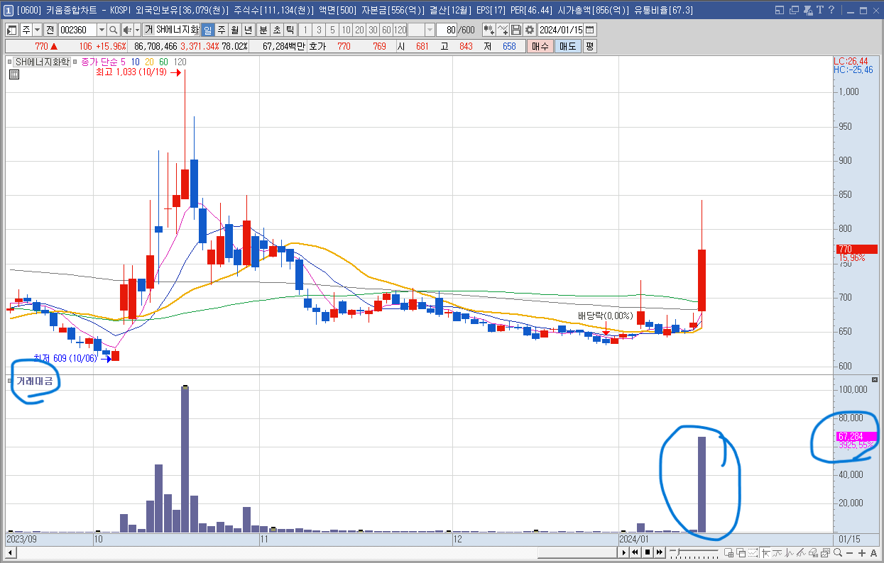 SH에너지화학의 현재가는 770원입니다. 마감가 770원이므로 내일 시장에 어떻게 반영이 되는지 주시할 필요가 있습니다. 그런데 현재가가 너무 작은 금액이므로 세력들의 작전이 들어갈 수 있기 때문에 주의할 종목이기도 합니다. 개미 투자자들이 주의해야 할 부분이 바로 이부분입니다.