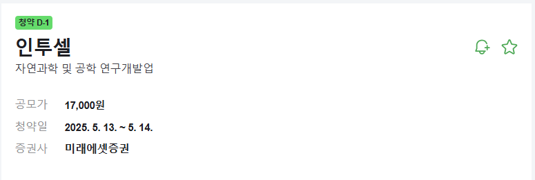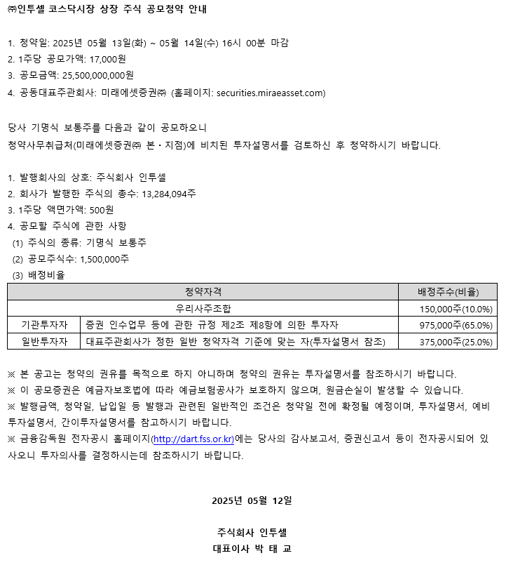 ✔️ 인투셀 공모주 청약은 내일(5월 13일)부터 시작되며, 이틀간 진행됩니다.